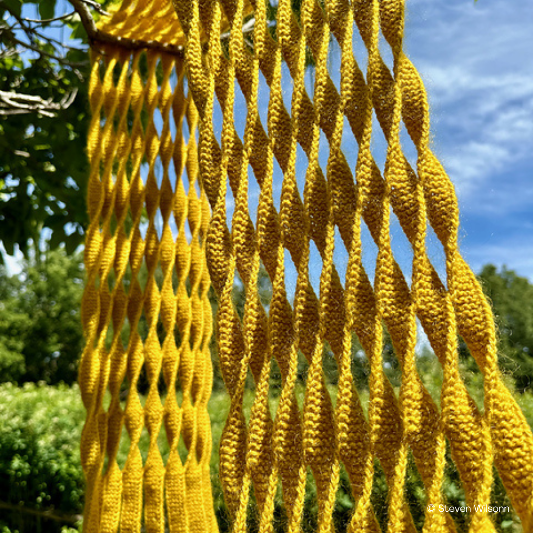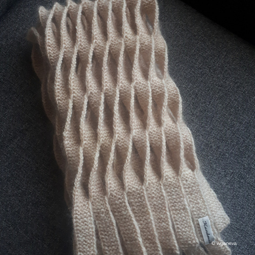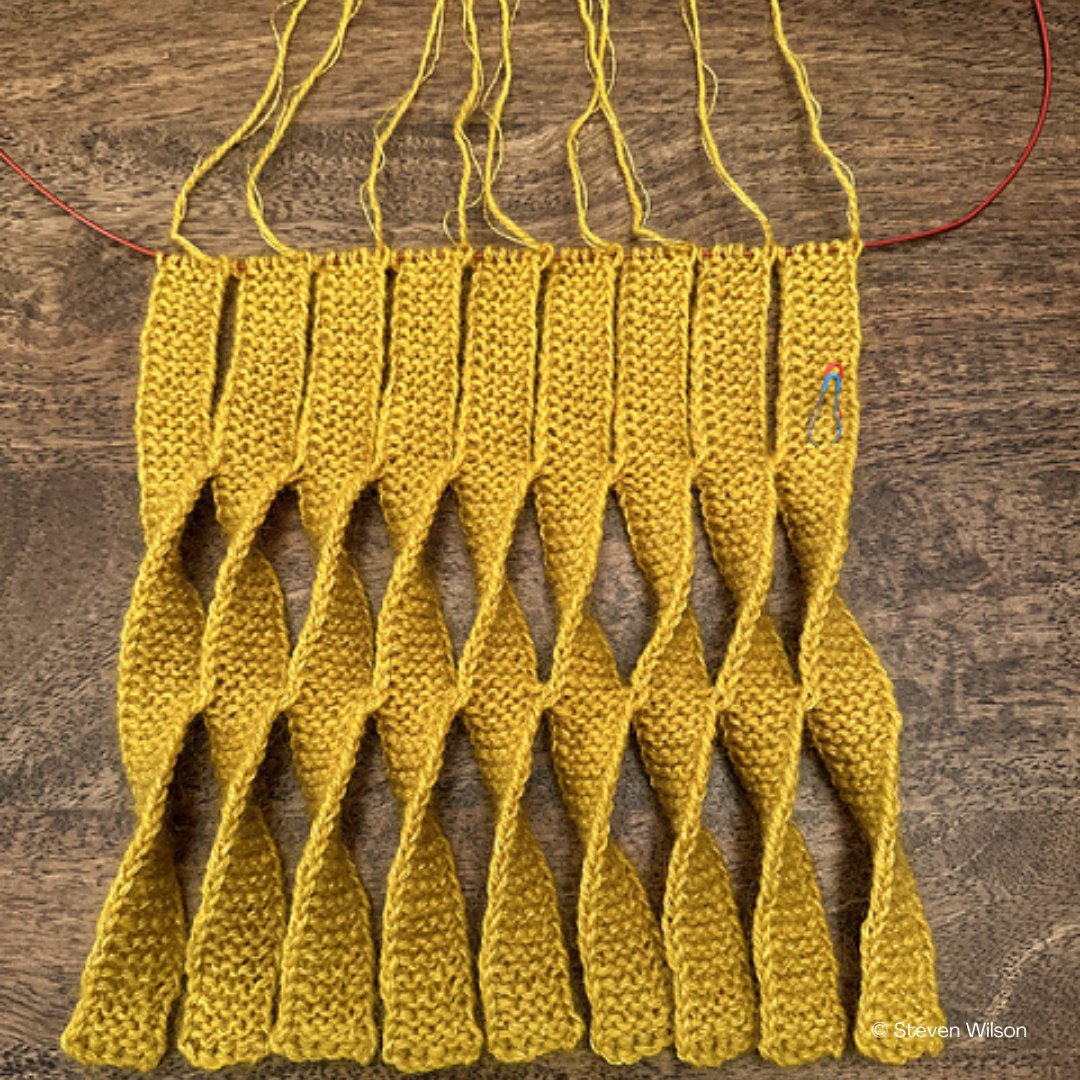 The Chiaroscuro by Alessandra Gropazzi features nine strips of purled garter stitch knit at the same time from nine balls of yarn. Strips are physically twisted at regular intervals and re-joined to create a twisted fabric.