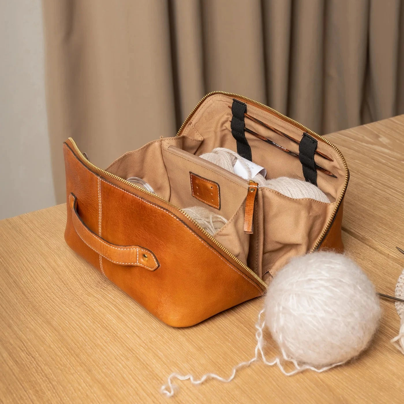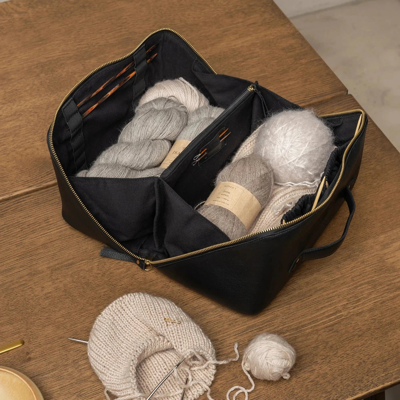 Project 9 is small but mighty - with two completely separate compartments that fold out flat, a zippered inside pocket, and several pockets lining either side of the interior, this bag has all the space you might need to carry small projects and notions.