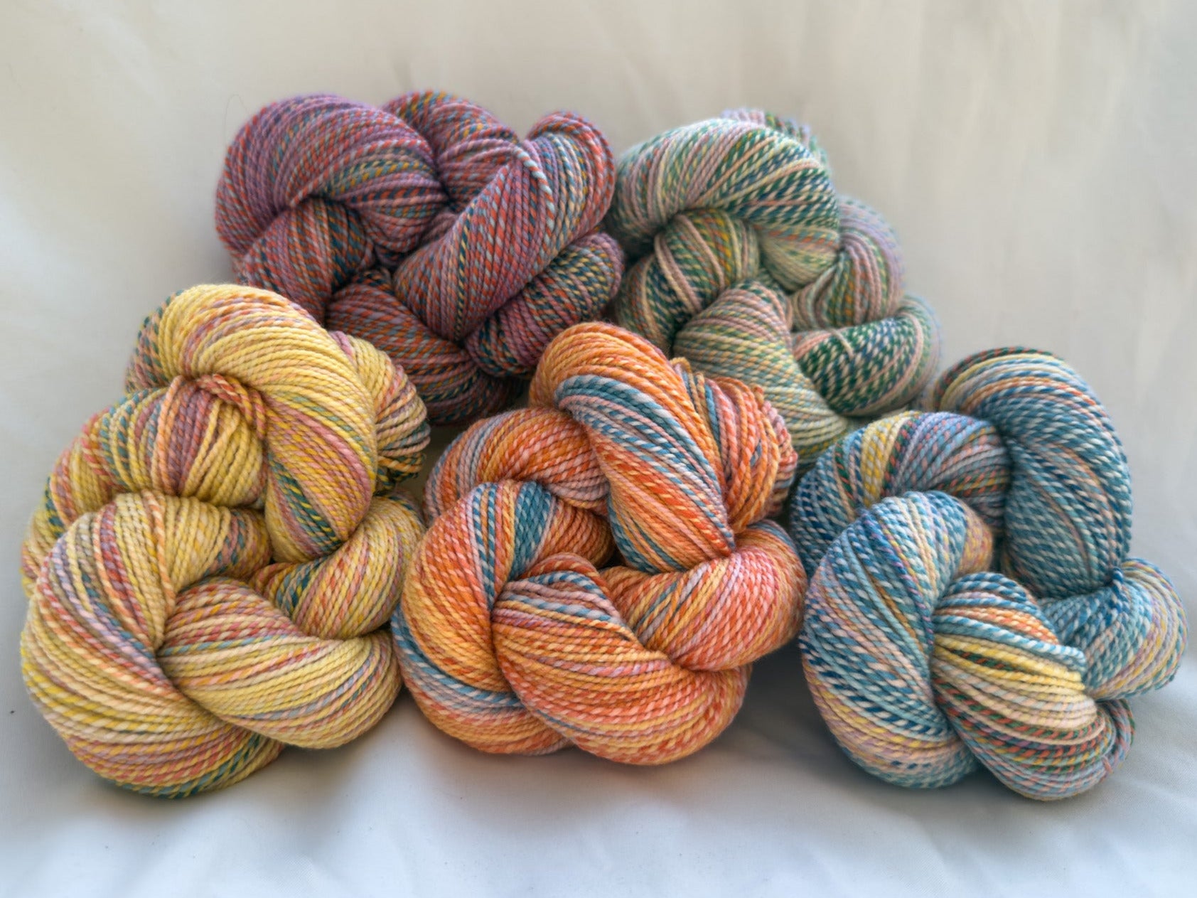 Welcome Switcheroo, our ONE OF A KIND, unique colorway from Spincycle in three different bases. Switcheroo is based on our community colors and values, with each skein swirling between our seven chosen colors for a gorgeous, unexpected fade in every project.